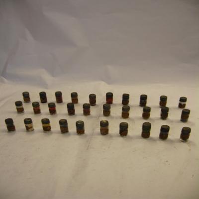 Colección de lo que parecen 30 colorantes o sustancias químicas, en frasquitos de cristal con tapón de metal. Son botes pequeños, cilíndricos, todos iguales. Hay de diversos colores.