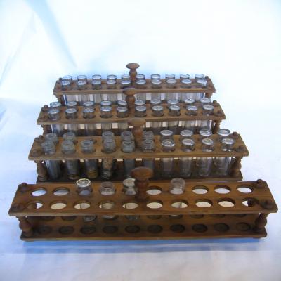 Conjunto de cuatro gradillas de madera, y 64 tubos de cristal.