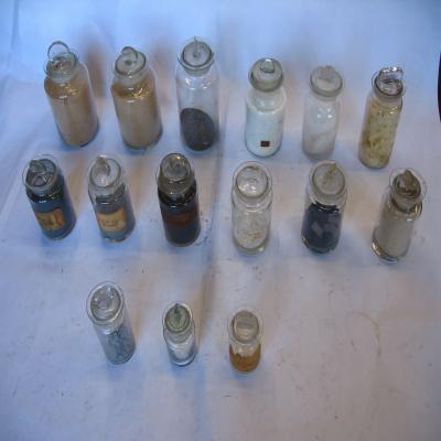 Colección de 15 botes de cristal con tapón de cristal. Hay de diferentes tamaños. Tienen el cuello ancho, y un tapón grueso de cristal con asa (uno la tiene rota). La mayoría no conserva la etiqueta con el nombre del contenidoo la inscripción se ha borrado, pero algunos sí: NaONO5 (Nitro ¿cutico?. Nitro. De ¿sosa?), alumbre de potasio, algdón, polvo de ¿esmeril?, negro animal.