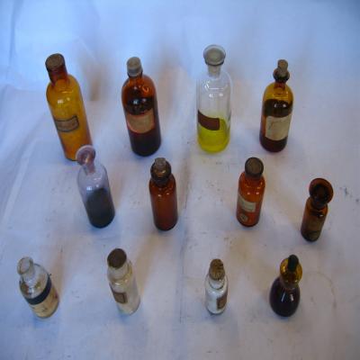 Conjunto de 11 botes de cristal con sustancias químicas. Son variados, de diferentes formas y tamaños, aunque todos de cuello estrecho. Algunos son de cristal transparente y otros de color marrón. Algunos tienen sustancias líquidas, otros polvos o cristales… Todos menos uno tienen tapón, bien de cristal, corcho o plástico. Algunos llevan etiquetas con el nombre del contenido, otros no la conservan entera, la inscripción se ha borrado, o simplemente no conservan la etiqueta.