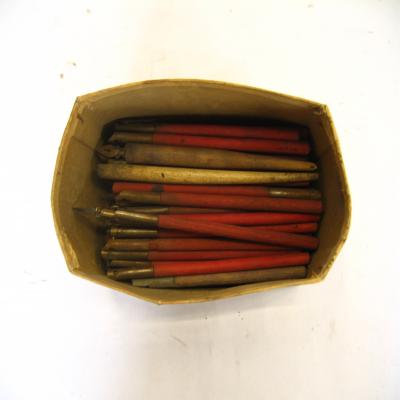 Conjunto de 62 palilleros escolares, de madera con punta de metal. Algunas tiene unida la plumilla. La mayoría son de madera pintada de rojo, uno verde y otras de madera normal. La mayoría son muy similares, aunque hay algunas más gruesas.