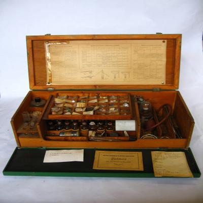 Caja para prácticas de mineralogía. Es una caja de madera dividida en varios comparimentos internos. La caja posee un laboratorio de mineralogía. Posee: -Minerales y rocas: En una bandeja. Hay aragonito, oligisto, pizarra, cromita, azufre, arcilla, calcita, feldespato, cuarzo, malaquita, augita, jaspe, hulla, thenardita, mica, talco, galena, fluorita, pirolusita, anhidrita, bauxita, baritina, pirita, grafito, mispiquel y sal gema. -Material: Una lámpara solplete con soporte, dos tubos grandes, uno más estrecho pero más alto, dos tubos pequeños, seis matracitos, seis tubitos curvos abiertos, carbones para ensayos, un embudo, varillas de vidrio, una cápsula de porcelana y dos de refractario, un morterito de metal, un tubo de cristal en forma de L, filtros plegados, dos imanes, diferentes tipos de papeles reactivos, una plaquita metálica dentro de un papel, uan losata para rayas, unas tenacillas, unas pinzas de acero, un escobillón, una pieza metálica unida a un mango de madera, hilo de platino, una perilla unida a un tubo de goma y uun bote de agua destilada. -Reactivos Líquidos: yoduro potásico, agua de yeso, nitrato de plata, ferrocianuro potásico, sulfato amónico, nitrato de cobalto, oxalato amónico, cloruro estannoso, acetato plomo, hipoclorito sódico, cloruro de abrio, ácido sulfúrico, fosfato amónico, carbonato amónico, cromato potásico, ácido nítrico, solución alcohólica de yodo, molibdato amónico, cloruro amónico, ácido clorídrico, amoniaco, sosa cáustica, carbonato sódico, agua de barita. Reactivos sólidos: nitrato potásico, limaduras de hierro, sulfuro potásico, bisulfato potásico, sal de fósforo, bórax, carbonato sódico, zinc en polvo, carbonato potásico. -Libro de instrucciones y una hoja escrita a mano sobre el contenido de la caja.