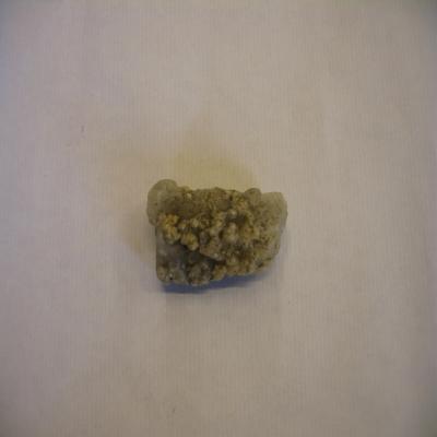 Calcopirita (amarillo latón) diseminada sobre siderita (color crema) y pequeños nódulos de cuarzo (blanco) en roca metamórfica.