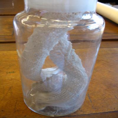 1: ejemplar no completo en el que se puede apreciar la forma tubular de este porífero. Uno de los extremos del cuerpo acaba en una especie de cerdas que provienen del propio esqueleto. No conserva el otro extremo completo.