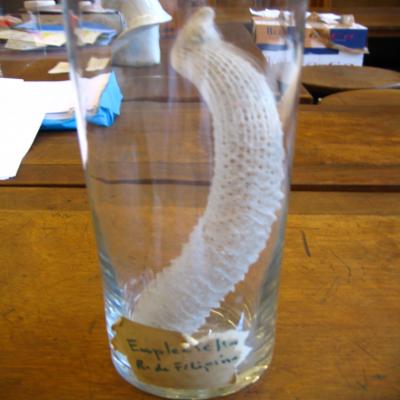 En bote de cristal. Etiqueta exterior pegada, antigua y en mal estado con inscripción en rotulador: "Euplectella. R. de Filipinas"