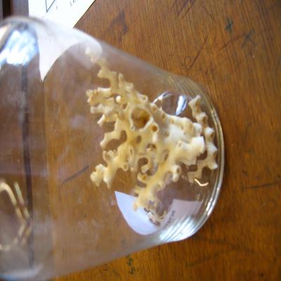 En bote de cristal. Etiqueta interior blanca a ordenador (de las que se hicieron para el 150 aniv. En 1995), con inscripción: "Gabinete de Historia Natural. Instituto Cardenal Cisneros. Colección de Corales".