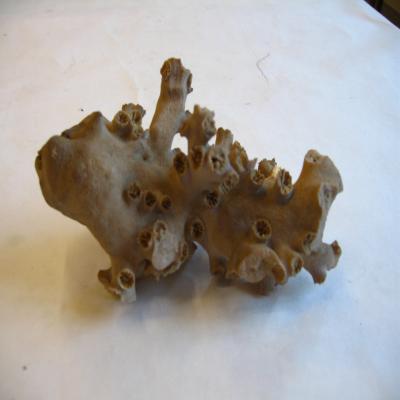 Ejemplar de esqueleto de coral colonial, con tabiques esqueléticos (escleroseptos)(característica del orden), de grandes dimensiones y textura rayada, con líneas longitudinales que recorren todo el cuerpo. Forma ramificada. Color blanquecino un poco oscurecido por el tiempo y la suciedad. Parece conservar la zona basal.