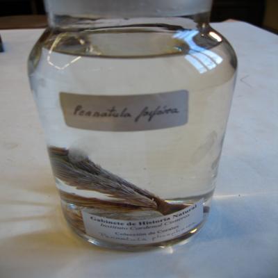 En bote de cristal. Conservado en líquido (alcohol). Posee tres etiquetas: