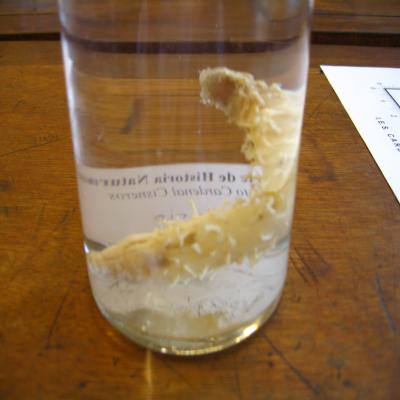 En bote de cristal. Conservado en líquido (alcohol). Posee dos etiquetas: