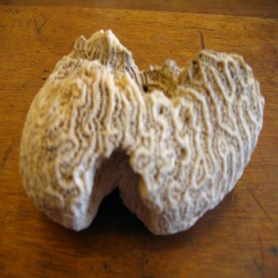Esqueleto colonial de coral con tabiques esqueléticos (escleroseptos)(característica del orden), de grandes dimensiones y forma masiva. Tiene forma de cerebro ("Coral cerebro"). Color blanquecino algo oscurecido por la suciedad y el paso del tiempo.