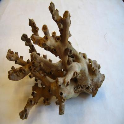 Ejemplar de esqueleto de coral colonial, con tabiques esqueléticos (escleroseptos)(característica del orden), de grandes dimensiones y textura rayada, con finas líneas longitudinales que recorren todo el cuerpo. Forma ramificada. Color blanquecino bastante oscurecido por el tiempo y la suciedad. Parece conservar la zona basal.
