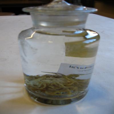 En bote de cristal. Conservado en líquido (alcohol). Posee tres etiquetas: