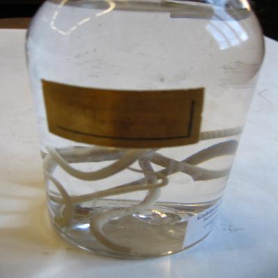 En bote de crital. Conservado en líquido (alcohol). Con cuatro etiquetas: