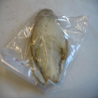 Concha interna casi completa de cefalópodo, de medianas dimensiones. Color blanco. Se observan el peiostraco y el mesostraco. El rostro está roto y no se conserva. Está un poco rota por uno de los extremos, pudiéndose ver internamente el mesostraco. La cara superior es más blanda (mesostraco), mientras que la superior (periostraco) es mucho más dura, formando como una base que protege a la parte más blanda. Esta concha interna es conocida comunmente como "jibia".