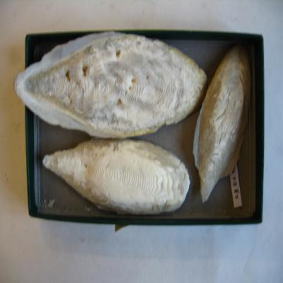 Molusco. Clase Cephalopoda(=Sifonopoda). Subcl. Coloidea (=Dibranchiata). O. Sepioidea Tres conchas internas completas de cefalópodo, de medianas y pequeñas dimensiones. Color blanco. Se observan el peiostraco, mesostraco y el rostro. La cara superior es más blanda (mesostraco), mientras que la superior (periostraco) es mucho más dura, formando como una base que protege a la parte más blanda. Esta concha interna es conocida comunmente como "jibia". En el ejemplar 050.1,el mesostraco posee unos agujeritos por su superficie, está algo deteriorada.