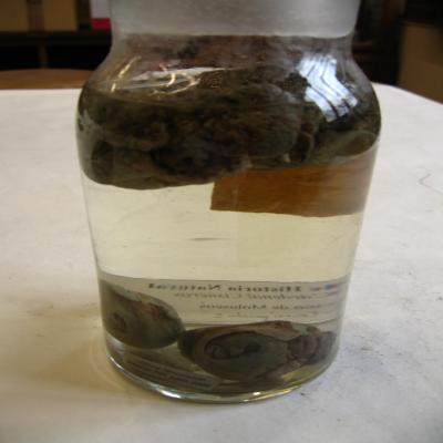 En bote de cristal. Conservado en líquido (alcohol). Posee tres etiquetas: