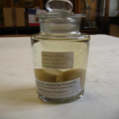 En bote de cristal. Conservado en líquido (alcohol). Posee tres etiquetas: