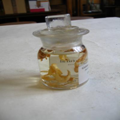 En bote de cristal. Conservado en líquido (alcohol). Con dos etiquetas: