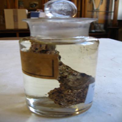 En bote de cristal. Conservado en líquido (alcohol). Con tres etiquetas: