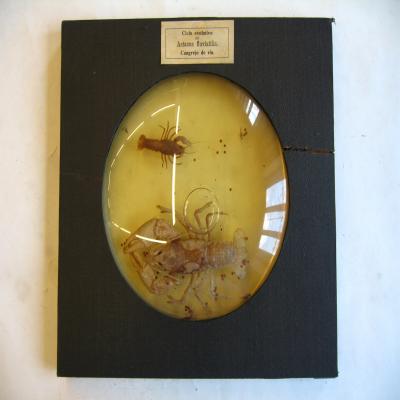 Una en la parte superior de la cara exterior, antigua, pegada, con inscripción a máquina: "Ciclo evolutivo del Astacus fluviatilis, Cangrejo de río.".