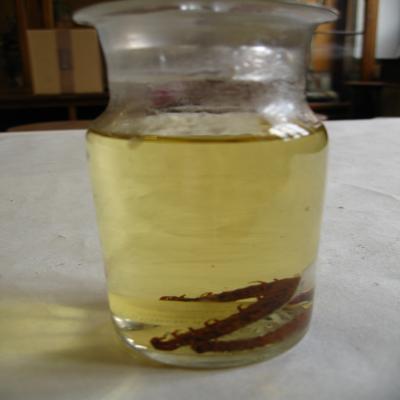 En bote de cristal. Conservado en líquido (alcohol). Con dos etiquetas: