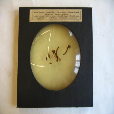 En un expositor que está formado por un círculo de cristal dentro de una cuadrado de madera forrado de tela negra. El recipiente posee líquido en su interior, en el que se encuentran las muestras sumergidas. Posee dos etiquetas: Una en la parte superior de la cara exterior, antigua, pegada, con inscripción a máquina: "Assellus aquaticus= Aselino comun. Oniscus murarius= Onisco de los muros (tachado). Oniscus scaber= Porcelio de las bodegas. Litobius forticatus= Litobio de tenazes. Armadillo vulgaris= Armadillo comun. Geophylus linearis= Geofilo linear. Julus terrestris= Julo terrestre.". Una en la parte de atrás del expositor,no completa, con inscripción a máquina: "...Koch, Munich.".
