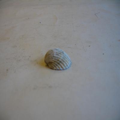 Valva un poco asimétrica, pues posee un lateral más plano que otro. Pequeño tamaño y color blanco. El umbo se eleva bastante sobre el plano de la charnela. Posee costillas radiales pronunciadas, y borde mellado debido a las costillas y los valles que se forman entre ellas. Le falta un trocito cerca del borde.