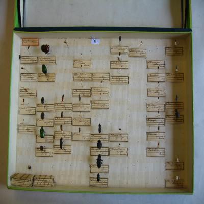 En una caja-expositor con la parte superior de cristal. Etiquetas escritas a bolígrafo, "Coléoptéres" y todas las de las especies. En la esquina inferior izquierda están amontonadas muchas etiquetas con nombres de especies. Un papelito en un alfiler con el número "8" escrito a rotulador.