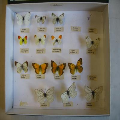 Pieris napi (c.e.), Euchloe ausonia (4 etiquetas, 2 ejemplares), Anthocharis belia (3 ejemplares, 2 machos y una hembra), Zegris eupheme hembra (2 etiquetas y un ejemplar), Colias hyale (c.e.), Colias crocea (3 ejemplares), Gonepteryx rhamni (s.e.), Aporia crataegi (3 ejemplares).
