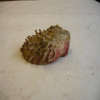 Valva que ha perdido el color, sólo se observa algo de rojizo en las puntas de algunas púas y en los laterales de la valva. Forma alargada, estilo ostra. Se observan las líneas de crecimiento concéntricas. Posee aurículas desiguales. En la superficie posee adherido lo que parece sutrato, y se puede observar el tubo de algún tuberario.
