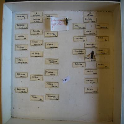 En una caja-expositor, con la parte superior de cristal, con las etiquetas de las especies y las de las familias ("-20-ORTÓPTEROS" Y "-15-DÍPTEROS") con escritas a máquina. La etiqueta del himenópteros está escrita con bolígrafo. También un papel en un alfiler con el número "21" escrito con rotulador.