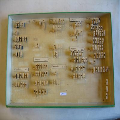 En una caja-expositor, con etiquetas para los géneros y las especies escritas con bolígrafo. Las etiquetas bajo los ejemplares pueden estar escritas a bolígrafo o a máquina. También un papel en un alfiler con el número "29" escrito con rotulador.