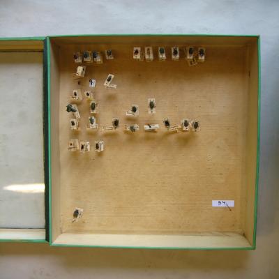 Caja-expositor con varias especies de coleópteros. Los ejemplares están situados en alfileres, a veces varios ejemplares en un mismo alfiler (la misma especie). Los alfileres pueden llevar pequeñas etiquetas escritas a máquina o con bolígrafo con el nombre de la especie, con información sobre su recolección, un número u otros datos.