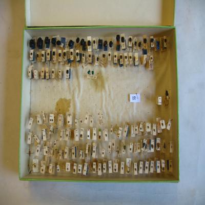 En una caja. Las etiquetas bajo los ejemplares pueden estar escritas a máquina o con bolígrafo. Hay un pequeño papel en un alfiler con el número "38" escrito con rotulador. En la cara interna de la tapa de la caja está escrito con bolígrafo "Cristian Casares B-II-55". Etiqueta en un lateral de la caja con inscripción a bolígrafo "B-II=55".