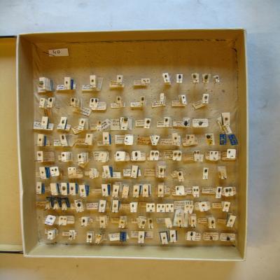 En una caja. Las etiquetas bajo los ejemplares pueden estar escritas a máquina o con bolígrafo.