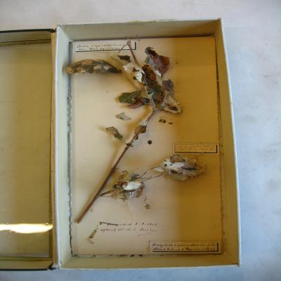 Artrópodo. Hexápodo. Subclase Pterigotos. O. Lepidoptera. Fam. Bombycidae Caja-expositor que debía de mostrar ejemplares de Liparia salicia junto un a una rama de álamo blanco (Populus alba). Los ejemplares no se conservan, sólo restos de ellos.