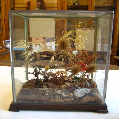 Pequeño diorama en el que varios insectos secos se diponen sobre un decorado vegetal (corteza de alcornoque, gramíneas, amapolas y dos agallas.