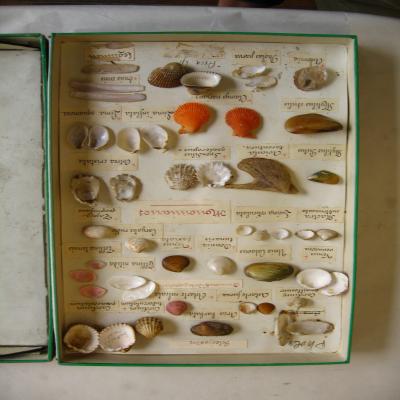 Caja-expositor que muestra distintos ejemplares de pelecípodos. Por lo general se encuentran las dos valvas del mismo ejemplar sobre una etiqueta con el nombre de la especie. Algún ejemplar se ha despegado y está suelto por la caja.