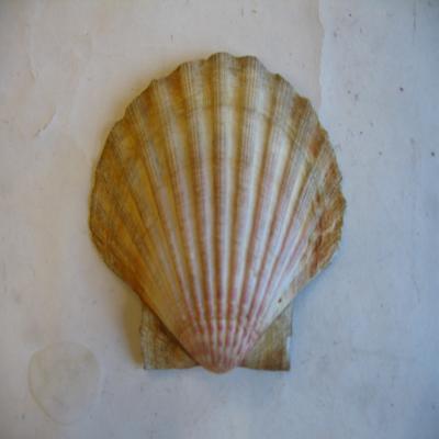 En la cara interna tiene una etiqueta pequeña, pegada, con inscripción a bolígrafo: "Pecten maximus".