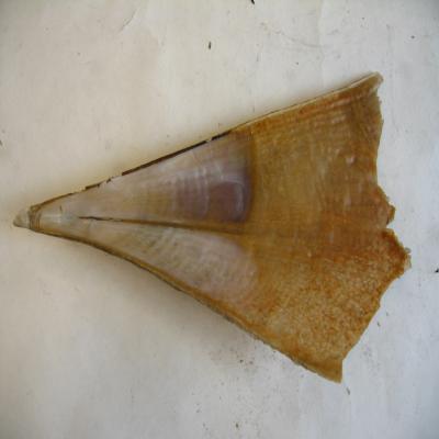 Valva grande, no completa, sólo corresponde a la parte anterior. En forma de paleta, con capa interna de nácar. Impresión muscular. Superficie rugosa y bastante transparente.