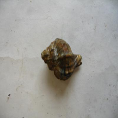 Concha espiral, ovoide-redondeada, con boca oval y canal sifonal no muy largo. Tiene como púas romas en la superficie de las espirales. Está muy oscurecida y tiene la superficie algo deteriorada, con algunos agujeritos. Dentro de la concha tiene encajada una valva de pelecípodo.