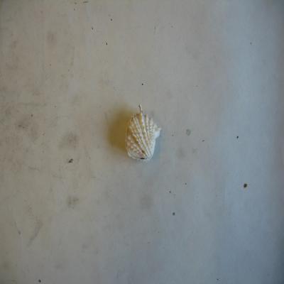Las dos valvas del mismo ejemplar unidas. Trapezoidal, valvas bastante simétricas. Umbo inclinado. Un lado es mucho más alargado y apuntado. Costillas radiales llenas de púas, en una de las valvas la última púa de la costilla más central es muy larga, tipo cuerno. Los espacios entre las costillas están formados por una superficie reticular. Color blanco.