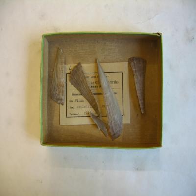 En una cajita, con una etiqueta antigua con inscripción a máquina: "104. INSTITUTO <<JOSÉ DE ACOSTA>>. Museo Nacional de Ciencias Naturales. MADRID (6). Colecciones suministradas a los Establecimientos Oficiales de Enseñanza. Gén. Pinna. Espec. semicostata Reeve. Localidad: Filipinas".