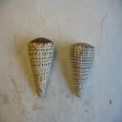 Molusco. Clase Gasteropoda. O. Neogasterópodos. Fam. Conidae Dos conchas cónicas, pesadas, grandes, espiral plana, boca alargada y estrecha, con un pliegue sifonal. Color blanco sucio con dibujo moteado variable. Interior blanco.