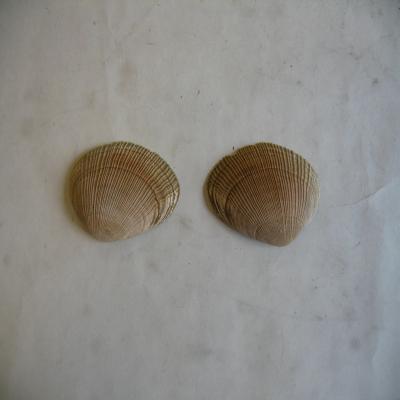 Molusco. Clase Pelecypoda. Subcl Heterodonta. Fam. Mactridae Las dos valvas del mismo ejemplar. Simétricas, ovales-alargadas, con el umbo bajo en inclinado, un lado más largo y apuntado. Costillas radials fuertes, y estrías concéntricas de crecimiento. Color parduzco. Interior blanco, con seno paleal grande y borde con muescas.