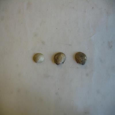 Molusco. Clase Pelecypoda. Subcl Pteriomorphia. Fam. Arcidae Tres valvas, dos pertenecen al mismo ejemplar. Simétricas, trapezoidales, con costillas radiales y estrías concéntricas. Umbo no central e inclinado, y un lado más alargado. Color blanco sucio o grisáceo. Interior blanco. Cierre recto, con dientes iguales. Borde dentado. Dos marcas musculares similares.