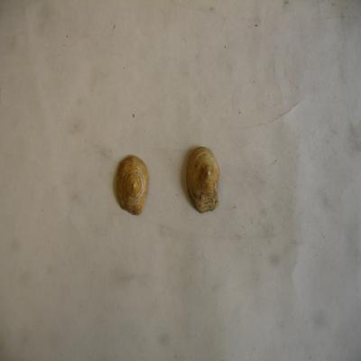 Dos conchas cónico-aplanadas, con ápice casi central y en punta. Superficie con estrías espirales. Color crema. Interior claro, con un septo.