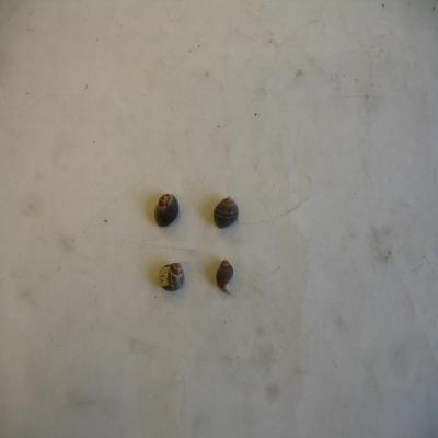Cuatro conchas redondeadas, de ápice alto, y espiras abombadas. Marcas espirales. Color pardo oscuro con líneas espirales más claras. Boca oval, amplia. Interior y columela blancas.