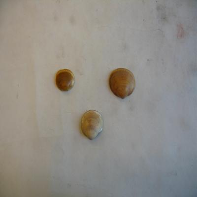 Molusco. Clase Pelecypoda. Subcl. Pteriomorphia. Fam. Glycymeridae Tres valvas, una triangular-redondeada y las otras más ovales. Líneas radiales y marcas concéntricas de crecimiento. Colores de blanco sucio a pardo, con alguna franja cocéntrica más oscura. Interior claro, borde interno con muescas, cierre con varios dientes iguales. Una de las valvas está rota en el vértice.
