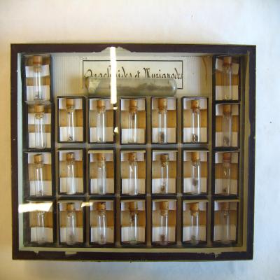 Cada animal dentro de un bote de cristal, y este a su vez dentro de una cajita, con una etiqueta con el nombre, procedencia y un número.